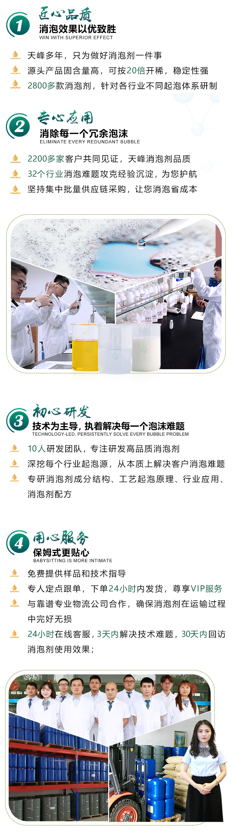 天峰消泡劑依托強大的研發(fā)能力和消泡劑行業(yè)應(yīng)用技術(shù),從消泡劑成分結(jié)構(gòu)的研究出發(fā),到